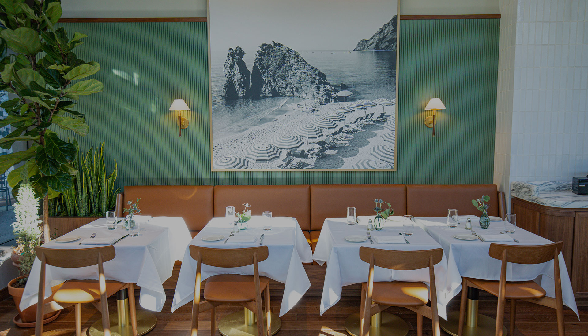 Upon entering the space, you are greeted by a wraparound bar area with plenty of bar seats, high-top tables, and lounge seating. The dining room features upholstered leather banquettes, warm woods, and brass accents. You can also dine on the outdoor patio.